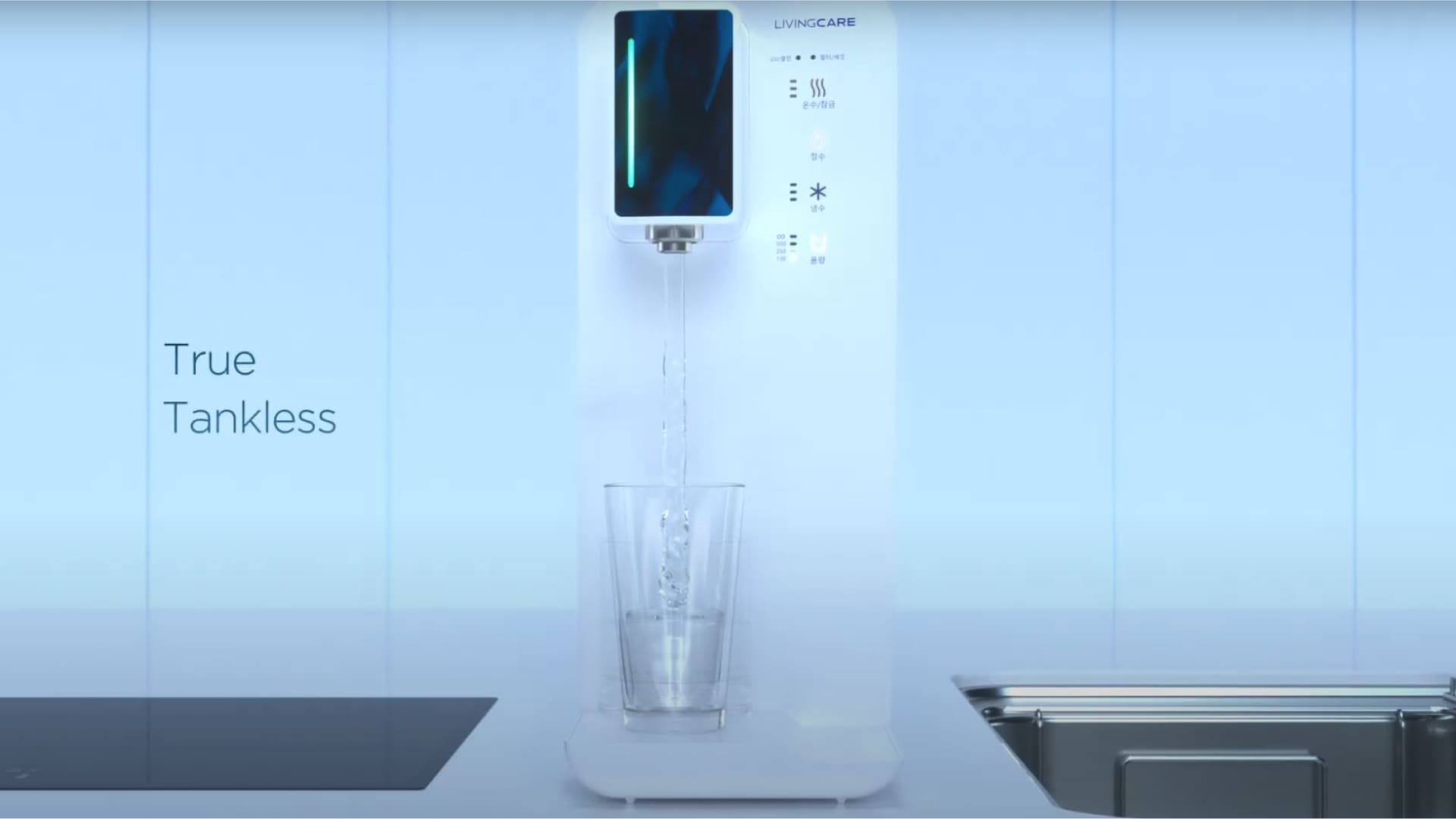 해당 정수기 제품을 모델링하여 제작하였고, 전체적인 제품의 디자인과 구조를 보여주며 영상이 시작됩니다.